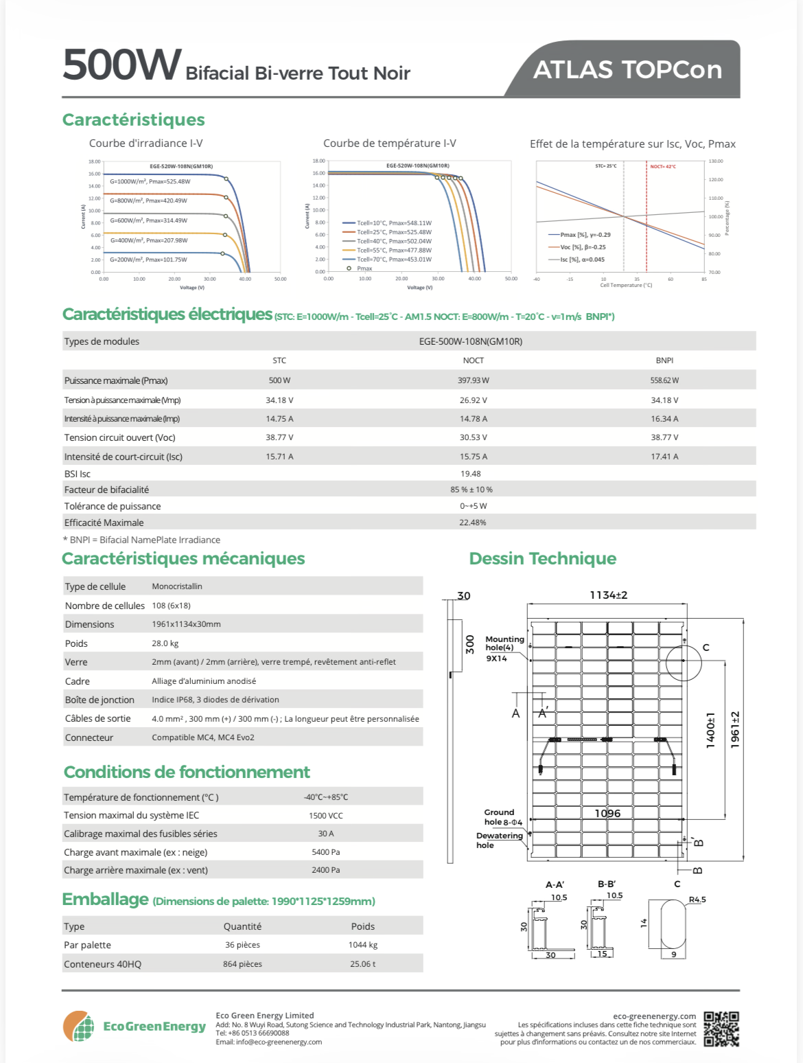 36x Panneaux solaires • ECO GREEN ENERGY 500W Monocristallin bi-verre bi-facial TOPCon - 1 Palette